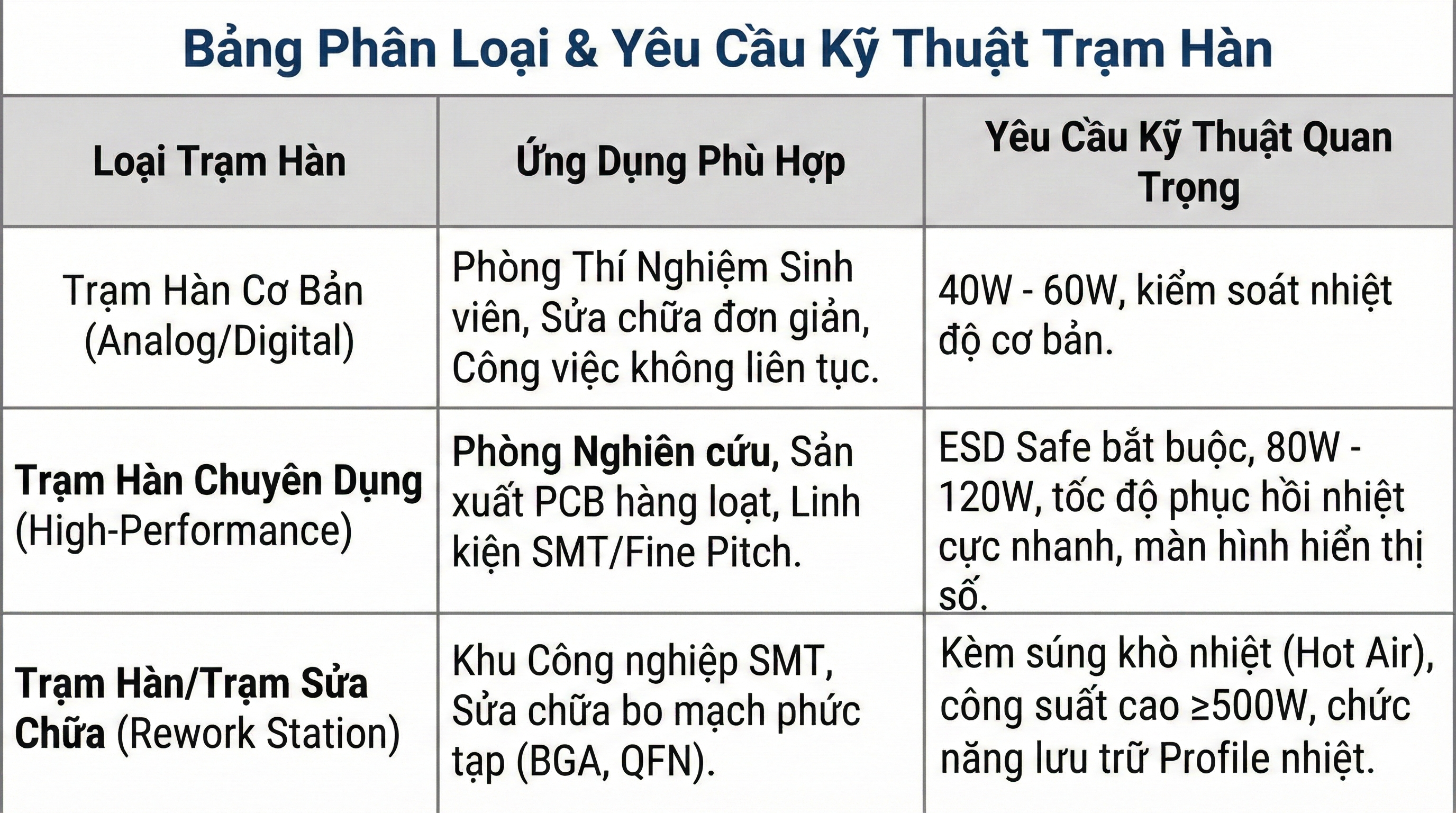 Việc đầu tư vào một trạm hàn chống tĩnh điện chất lượng là khoản đầu tư thông minh vào chất lượng sản phẩm và tuổi thọ linh kiện.
