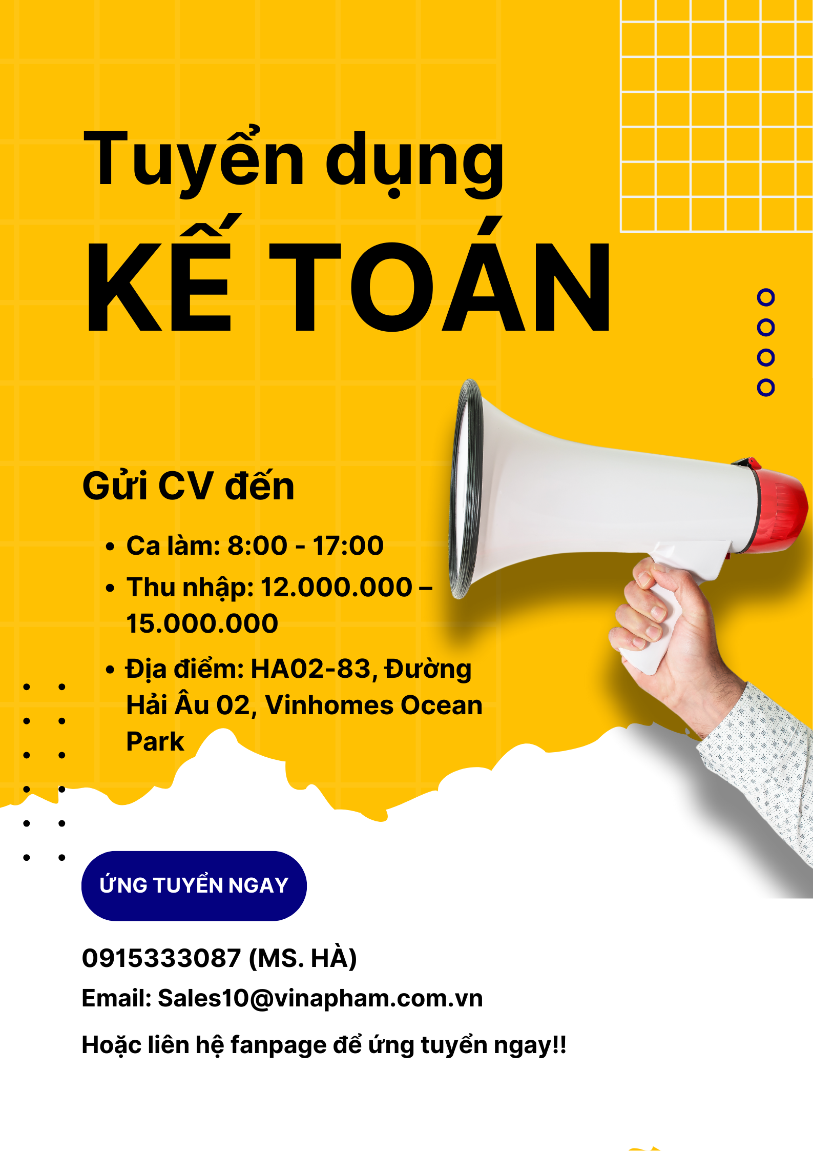 Số điện thoại liên hệ: 0915 333 087 (Ms. Hà)